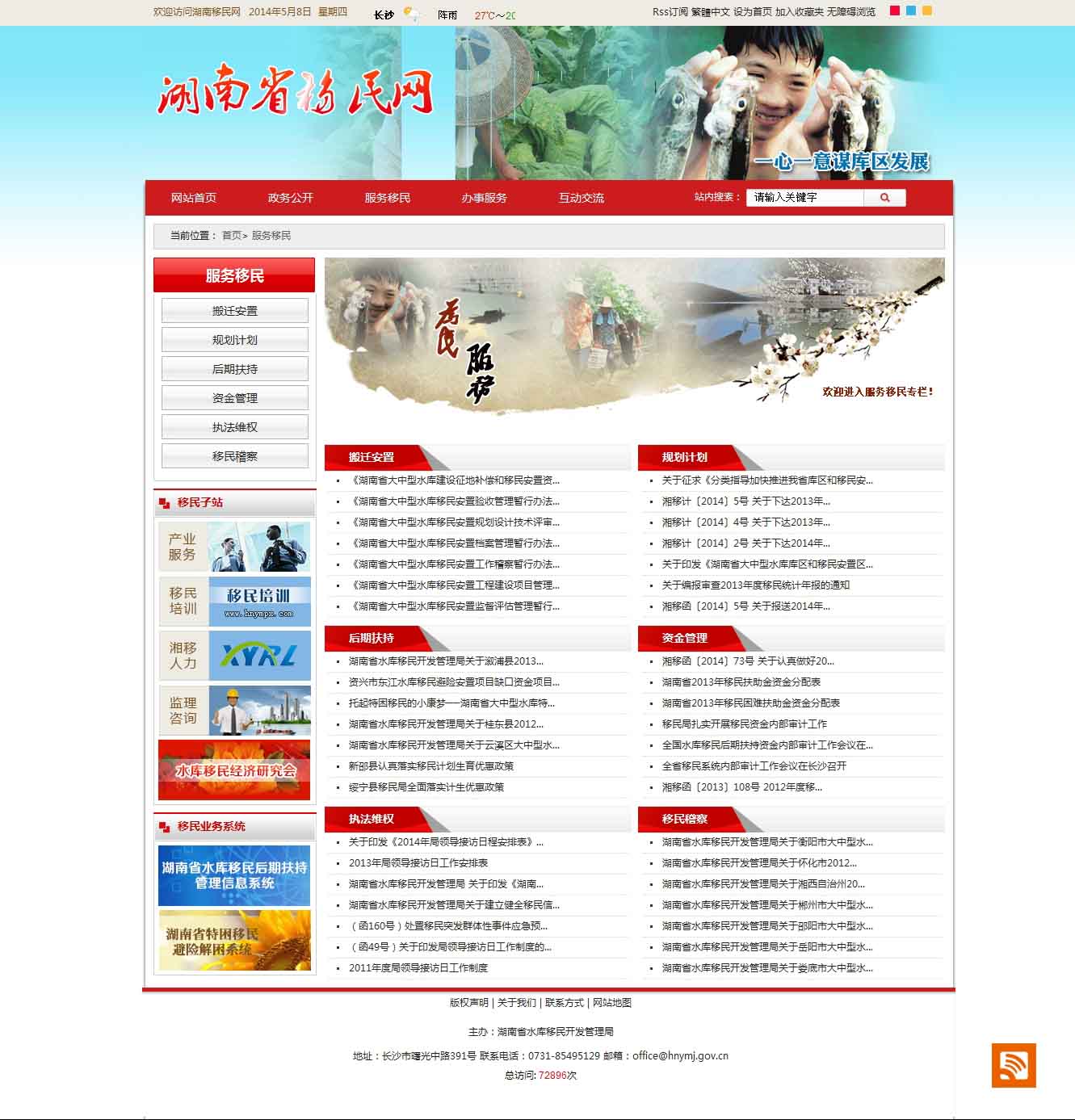 湖南省水库移民局门户网站是湖南省水库移民开发管理局领导亲自关心、指导下建立和发展起来的水库移民局门户网站,这是一个依托因特网,集“对外宣传、政务公开、网上办事、公共服务、互动交流”功能于一体的水库移民局门户网站。是展示湖南省水库移民开发形象的总窗口,为民服务的总平台,联系群众的现代化桥梁。